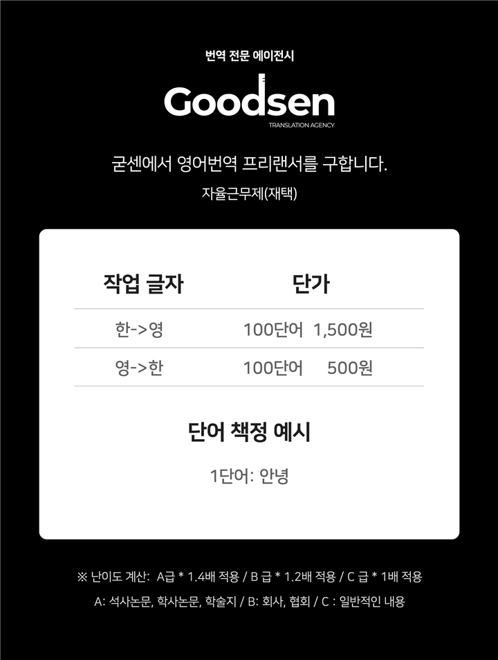 재택모음 긱잡 도우미 2일전 굳센 D-11 집에서 일해요 👉 영어 번역 프리랜서(재택) 채용 시급 10,030 상세보기 모집 내용 담당업무 및 자격요건번역·통역- 담당업무: 논문, 학술지, 회사, 협회, 일반적인 내용 등 번역 근무조건근무기간: (협의가능)근무요일: 요일협의근무시간: 시간협의 지원조건학력: 학력무관 접수방법접수방법: 알바몬 온라인지원